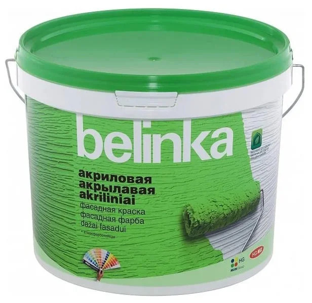Belinka Акриловая фасадная краска - Качественная краска, изготовленная на основе акриловой дисперсии. Предназначена для защиты и декоративного оформления фасадов и любых других внешних минеральных поверхностей. Подходит также для ремонтной окраски старых дисперсионных покрытий. Отличается хорошей адгезией к большинству оснований, высокой водоотталкиваемостью, хорошей устойчивостью к климатическим воздействиям и вредной промышленной среде. Высохшая акриловая фасадная краска также устойчива к мокрому трению.
