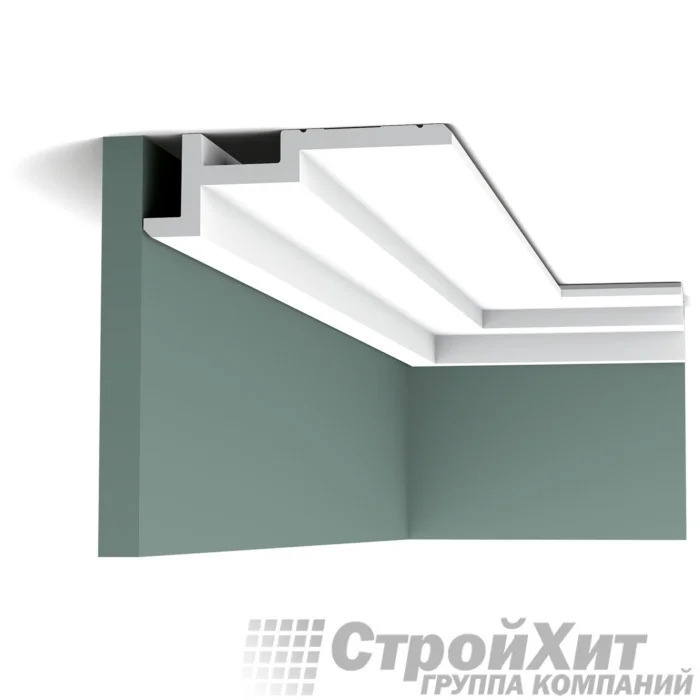Строгий и современный профиль из серии Steps. Здесь мы разместили самую длинную сторону карниза на потолке, чтобы визуально расширить помещение. Модель имеет срезанный угол сверху и снизу, благодаря чему создается тонкая линия тени. Разработан дизайнером Орио Тонини.