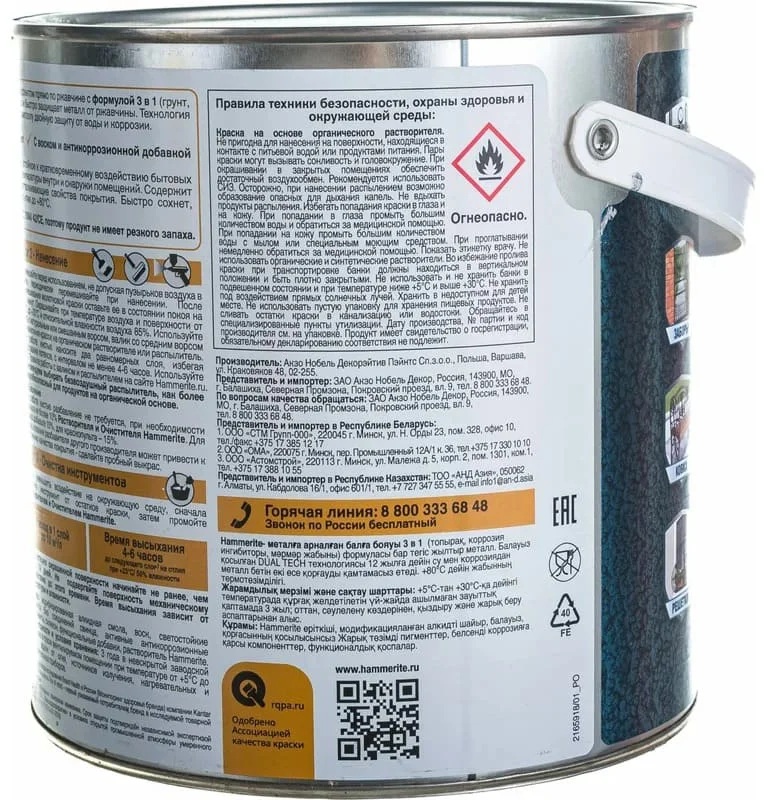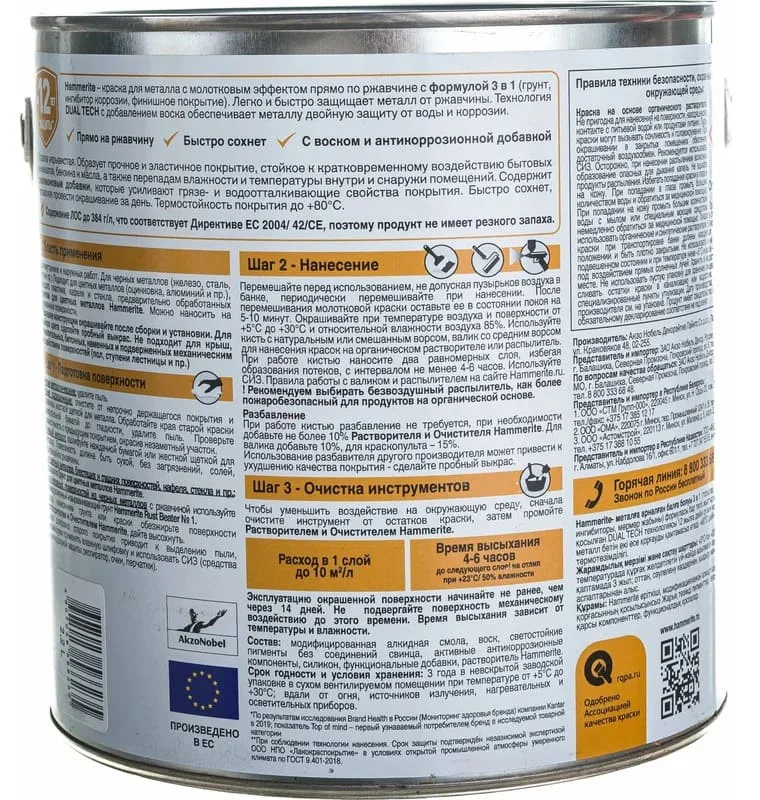 Уникальная формула 3 в 1: Грунт — выравнивает поверхность. Защита от коррозии — останавливает ржавчину. Финишное покрытие чешуйчатой структуры — блокирует путь воде, не допуская ни капли ее до металла. Содержит активные антикоррозийные добавки (фосфат цинка). Благодаря технологии Dual Tech c добавлением воска, Hammerite обеспечивает двойную защиту металлической поверхности от воды и коррозии до 8 лет. Образует износостойкое и эластичное покрытие, которое остается устойчивым и не растрескивается при перепадах влажности и температуры внутри и снаружи помещений. Hammerite обладает чешуйчатой структурой, служащей дополнительным барьером на пути кислорода и воды к металлической поверхности. Содержит силиконовые добавки, которые создают усиленный барьер для влаги и грязи. Покрытие устойчиво к воздействию бытовых химикатов и кратковременному воздействию моторного топлива и масел. Быстро высыхает на поверхности благодаря особым компонентам, входящим в состав краски. Время до нанесения второго слоя составляет около 4–6 часов, поэтому вся работа может быть завершена за один день. Легко наносится без разбрызгивания и потеков, является тиксотропной краской. Обеспечивает экономичный расход — одним литром можно окрасить до 10 м2 подготовленной поверхности