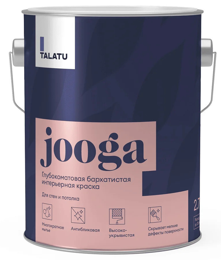 Краска TALATU JOOGA- водно-дисперсионная полиакриловая краска глубокоматового типа, предназначенная для отделки стен и потолков. Подходит для помещений, где предъявляются повышенные требования к качеству воздушной среды и микроклимата, а также для зон с умеренной эксплуатационной нагрузкой. Может применяться в жилых пространствах, коридорах, гостиных, спальнях, детских, а также в дошкольных и образовательных учреждениях. Совместима с бетонными, оштукатуренными, зашпатлеванными поверхностями, гипсокартоном и стеклообоями.