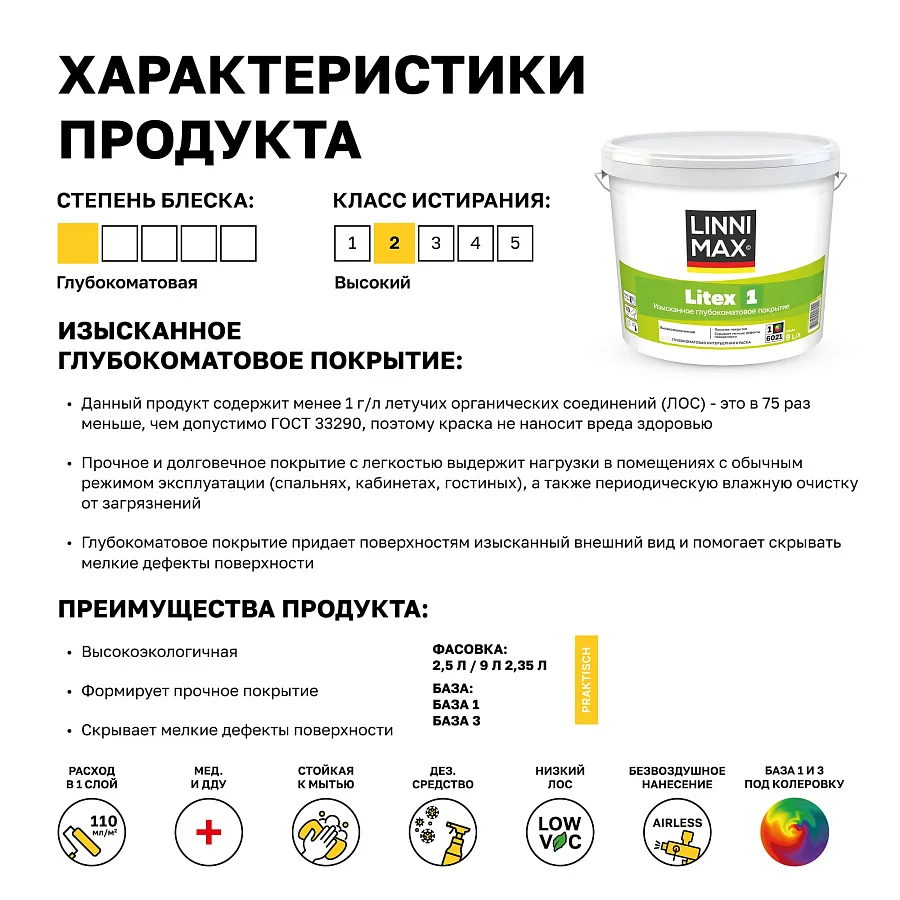 Высокоэкологичная латексная краска без вреда для здоровья, долговечная и стойкая к мытью.