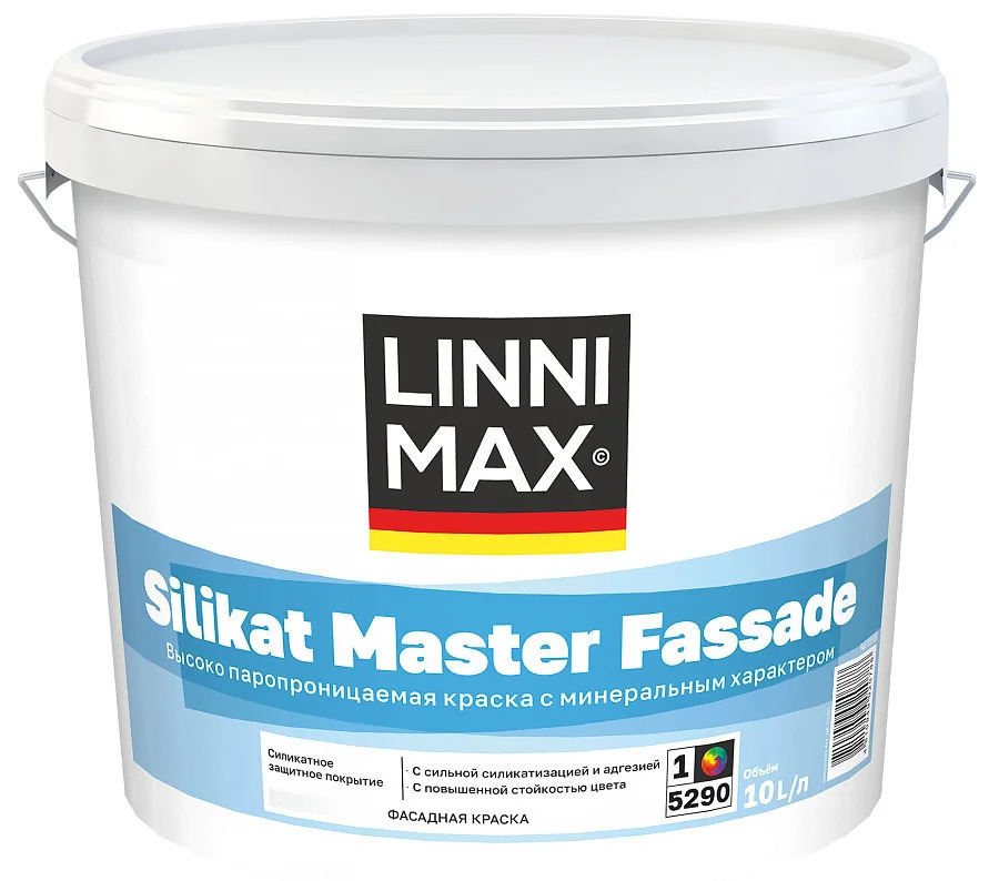 Водно-дисперсионная одно-компонентная силикатная фасадная краска для матовых, стойких к атмосферным воздействиям, паропроницаемых покрытий.