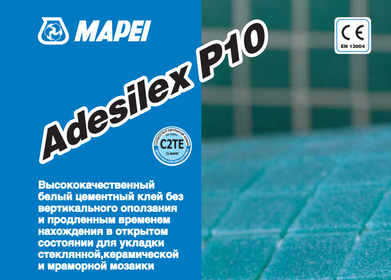 Adesilex P10 - улучшенный (2) цементный клей (С) без вертикального оползания (Т) и продленным временем нахождения в открытом состоянии (Е), принадлежащий к классу С2ТЕ. Adesilex P10 имеет маркировку CE в соответствии с сертификатом ITT N° 94140201.101 (SFV), выпущенным Säurefliesner-Vereinigung e.V. Grossburgwedel Laboratory (Германия).