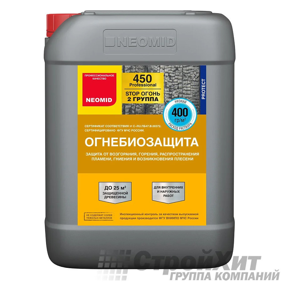 NEOMID 450 защищает древесину на срок до 7 лет от возгорания и распространения пламени, обеспечивая II группу огнезащитной эффективности согласно ГОСТ Р 53292 (переводя древесину в трудновоспламеняемый материал), и на срок 8-10 лет от гниения, возникновения плесени, при отсутствии контакта с влагой. Применяется как защитная пропитка для обработки деревянных стен, балок, стропильных систем, несущих брусьев, перекрытий, лаг, оконных и дверных блоков, а также других конструкций из древесины различного назначения.