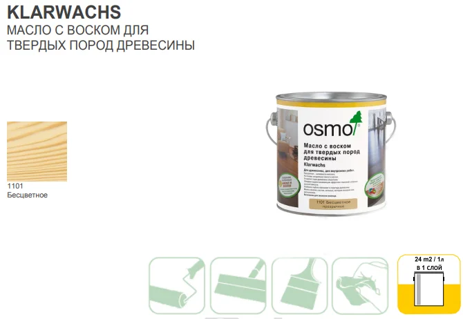 Osmo-масло Klarwachs можно наносить с помощью кисти, ветоши, методом окунания или распылением. Рекомендуется наносить масло при помощи кисти или ветоши тонким слоем вдоль волокон древесины.