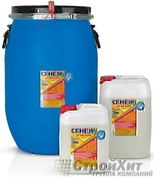 Средство Сенеж Огнебио упаковывают в полиэтиленовые канистры массой нетто 5 кг, 10 кг, полимерные бочки со съемной крышкой массой нетто 65 кг, а также транспортные контейнеры со сливным краном массой нетто 1000 кг.