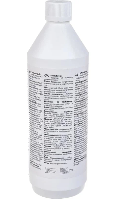 Избегать применения моющих средств и интенсивной очистки свежеокрашенной поверхности, так как покрытие достигает своей окончательной твердости и стойкости в течение примерно одного месяца после окраски. Очищать поверхность средством Tikkurila Supi Saunapesu (0,1-0,2 л средства на 5 л воды). Сильно загрязненные поверхности можно очищать неразбавленным Tikkurila Supi Saunapesu. Для отбеливания полков применять разбавленный в воде состав Tikkurila Supi Saunapesu (в соотношении 1:1). Дать воздействовать 15 минут и промыть чистой водой. При необходимости, обработать заново составом Tikkurila Supi Laudesuoja